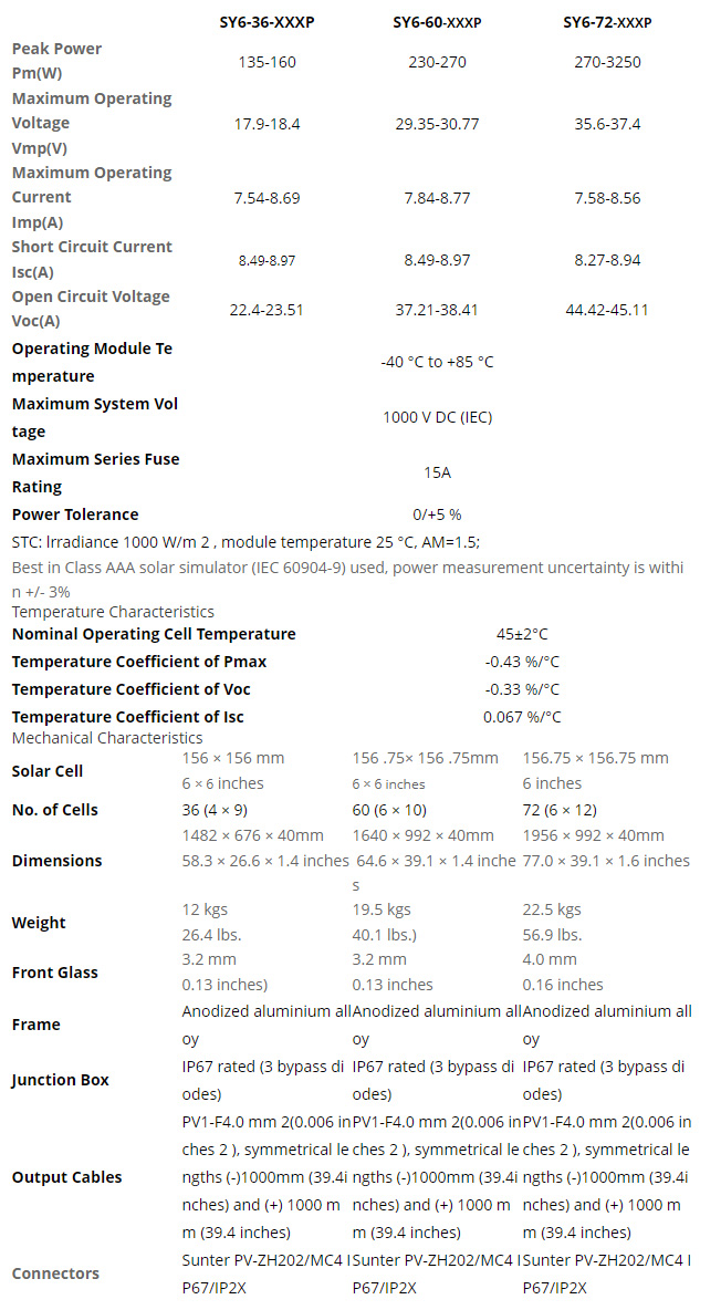 Monocrystalline Solar Panel Specifications
